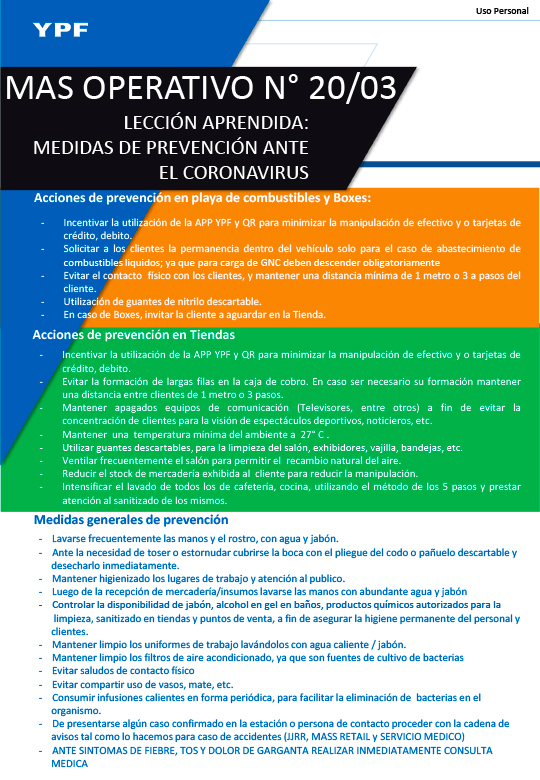 Atento a la pandemia producida por el COVID-19, YPF emitió un documento conteniendo acciones de prevención para la zona de playa, boxes y tiendas, más una serie de medidas generales de prevención.