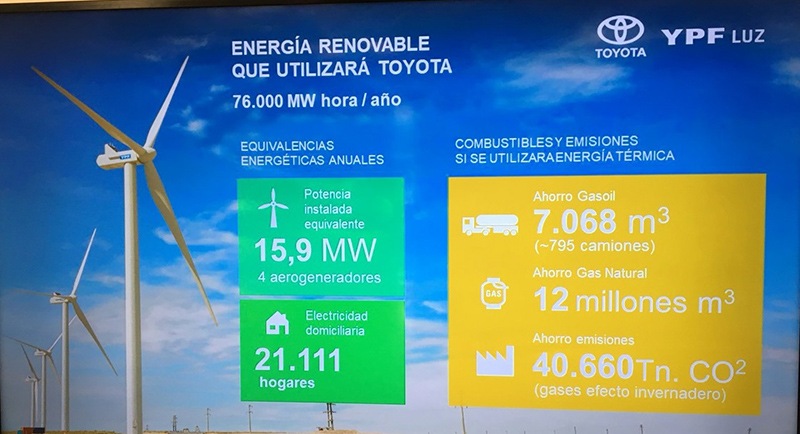 El contrato de provisión de energía renovable con YPF Luz tiene una duración de 10 años, por un total de 76.000 MWh/año. La energía eléctrica que utilizará Toyota equivale a 15,9 MW de potencia instalada, la cual representa la generación de más de cuatro aerogeneradores para abastecer la demanda de la planta de Zárate y es equivalente al consumo de 21.111 hogares.