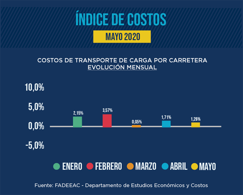 Los costos para el transporte de cargas por carretera registraron un incremento de 1,26% en mayo según el estudio mensual que realiza el Departamento de Estudios Económicos y Costos de la Federación Argentina de Entidades Empresarias del Autotransporte de Cargas (Fadeeac) y que mide 11 rubros que impactan directamente en los costos de las empresas del transporte de cargas de todo el país.