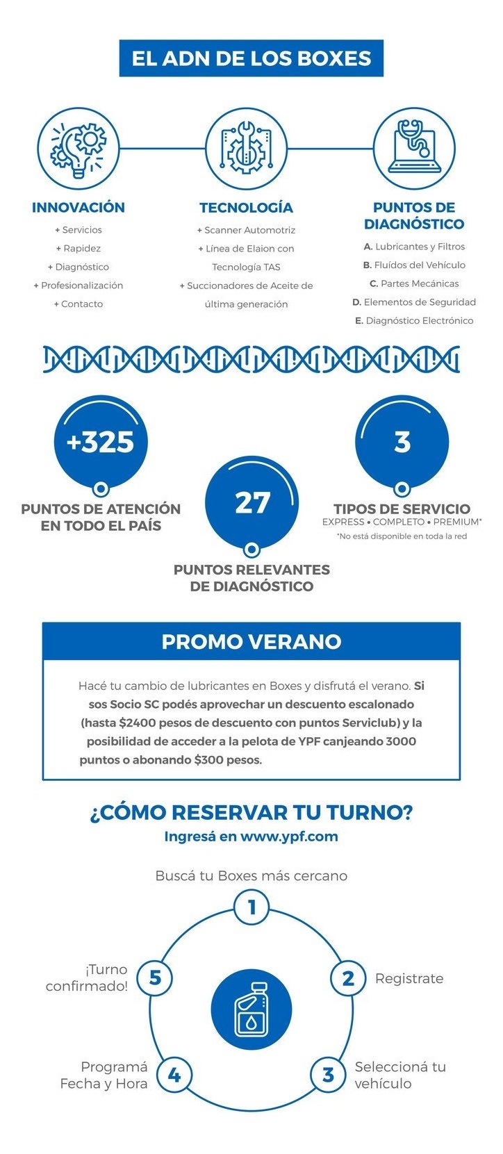 YPF Boxes, que es una red de cobertura nacional con más de 325 puntos ubicados en todo el país, cuenta con profesionales que revisan los puntos más importantes del auto como las partes mecánicas, fluidos y filtros y elementos de seguridad. Además, al finalizar el servicio, se entrega un certificado con el informe técnico de la revisión vehicular que incluye la garantía sobre el lubricante utilizado.