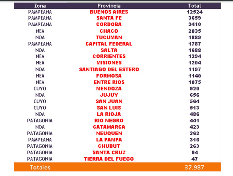 En cuanto a las regiones con más ventas, CADECOM ubica en la cima a la provincia de Buenos Aires con 12.524 patentamientos, seguida por Santa Fe, con 3.659, y Córdoba, con 3.410.