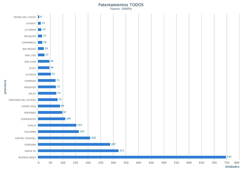 Respecto al informe mensual de la Cámara, las provincias con más patentamientos en septiembre 2020 fueron: Buenos Aires con 8.328, Santa Fe con 3.500 y Córdoba con 2.878. Las siguen Chaco con 2.193 y CABA con 1.902.