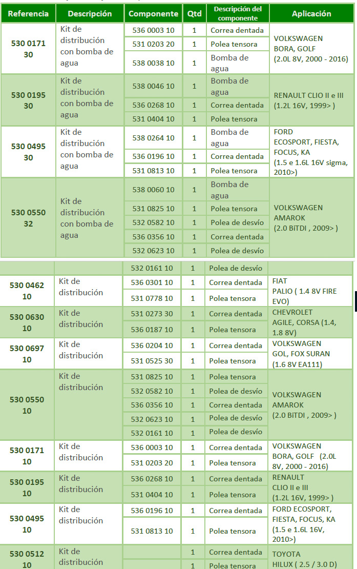 Los kits ahora ensamblados en Argentina también se comercializarán a través de distribuidores autorizados directamente a los minoristas de autopartes. Para vehículos livianos, la solución consiste en correa de distribución, tensor, polea tensora y accesorios como tornillos, arandelas y tuercas, y también puede contener la bomba de agua.
