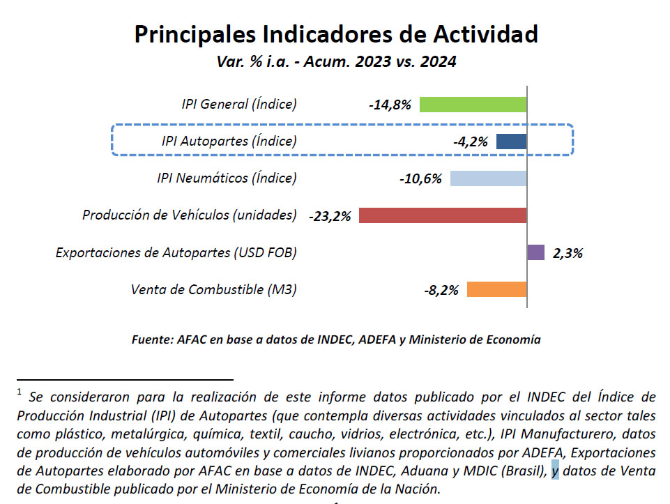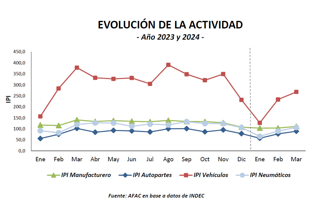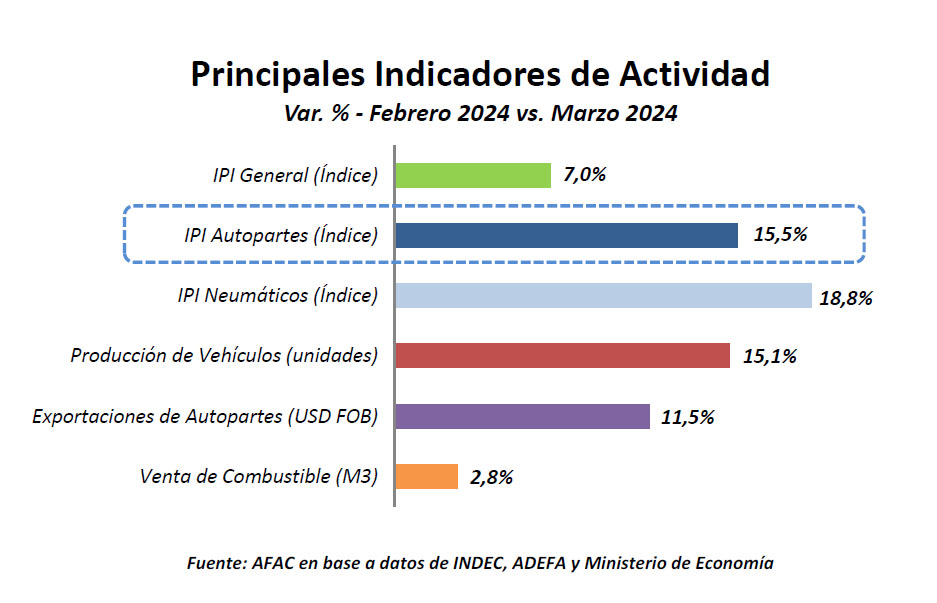 El sector autopartista presentó durante el primer trimestre de 2024 una caída en su nivel de actividad de 4,2% respecto al mismo periodo de 2023. Al comparar el mes de marzo de 2024 con el mismo mes de 2023, se verifica una reducción de 12,7% y al compararlo con febrero de 2024 se observa un aumento de 15,5%. Todos los rubros vinculados a la Cadena de Valor Automotriz presentaron comportamientos similares al Autopartismo, a excepción de las exportaciones que presentaron un aumento para el acumulado.