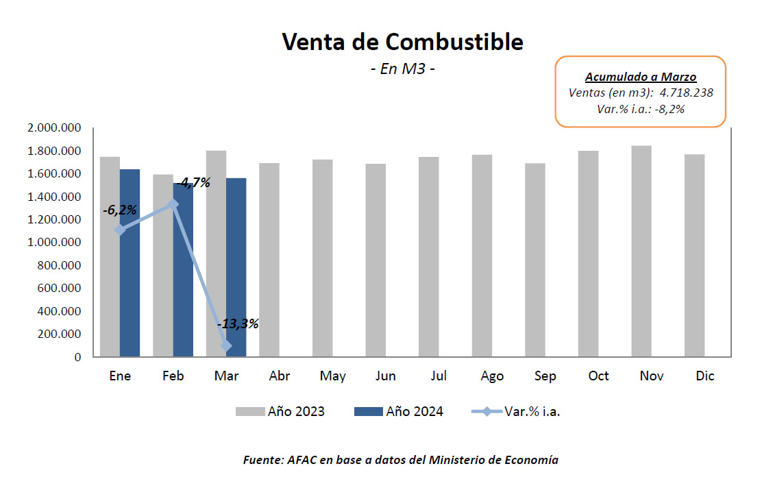 Para el segmento de mercado de reposición, al considerar la venta de combustible como un indicador aproximado del nivel de actividad del mismo, se observó una caída para el primer trimestre que se ubicó en 8,2%% interanual.
