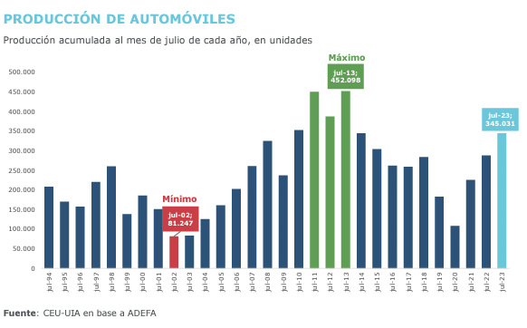 Durante el mes de julio, el sector automotor registró una suba interanual en la producción. Sin embargo, la tasa de crecimiento (+11,9% interanual) volvió a ubicarse en niveles más bajos que en la primera parte del año.