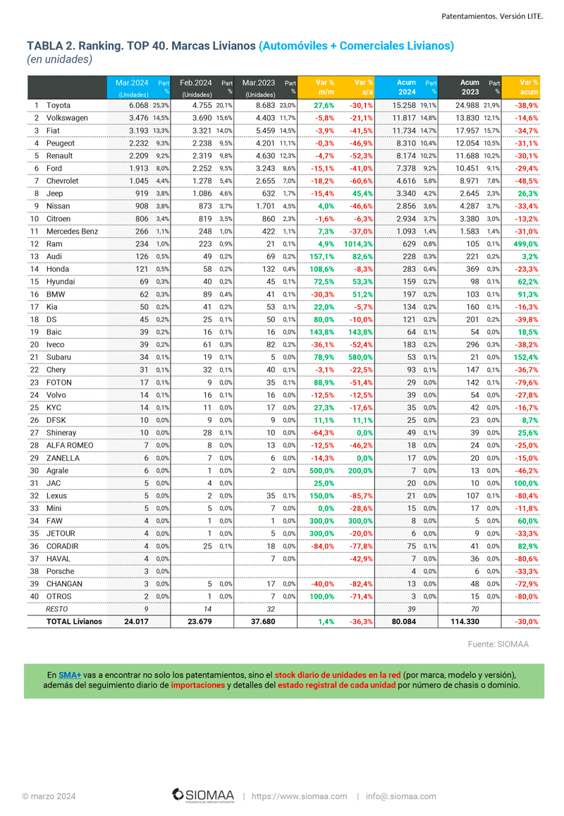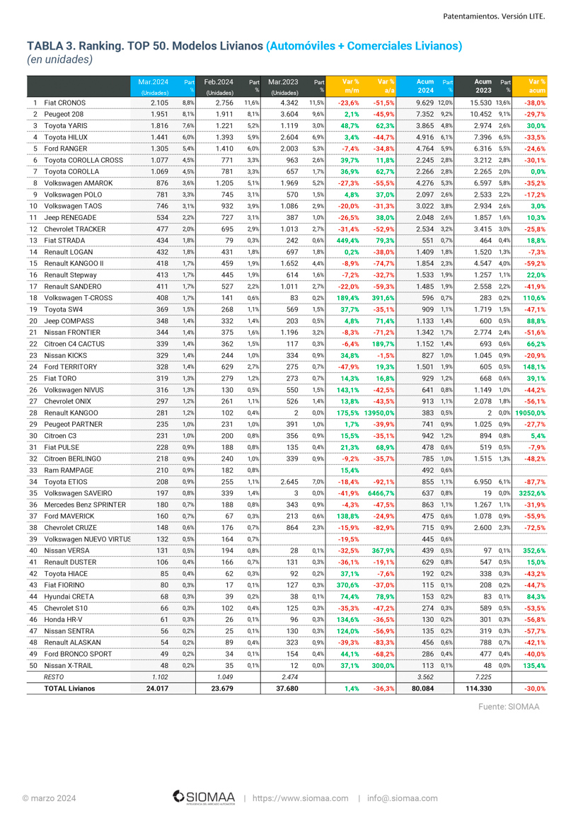 En cuanto a las marcas, Toyota lideró las ventas tanto en marzo como en el trimestre completo (6.068 y 15.258, respectivamente), seguida por Volkswagen (3.476 y 11.817) y Fiat (3.193 y 11.734).