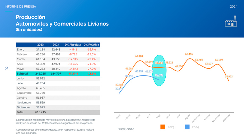 En el acumulado de los primeros cinco meses de 2024, las terminales produjeron un total de 184.707 vehículos de pasajeros y utilitarios, 23,8% debajo respecto de las 242.255 unidades que produjo en el mismo período del 2023.