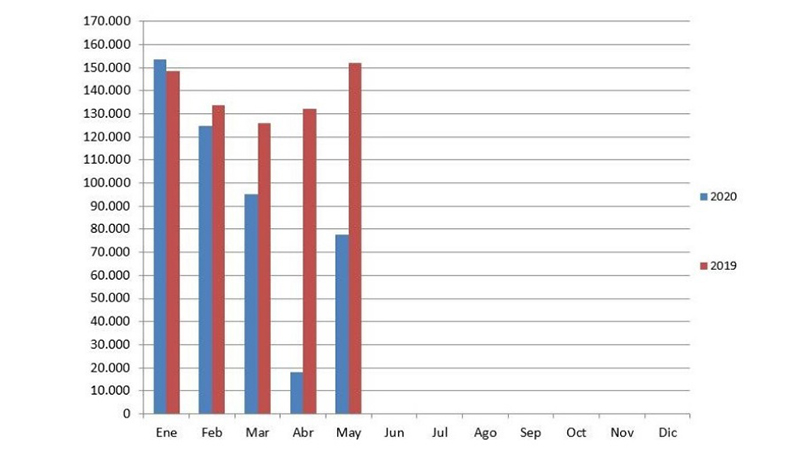 En los 5 primeros meses se vendieron 468.874 unidades, un 32,30% menos que en igual período de 2019 (692.585 vehículos).
