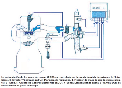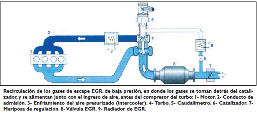 Respecto a la recirculación de los gases de escape (EGR), esta permite una disminución parcial de la presión del oxígeno contenido en el aire, y de la temperatura máxima de la combustión. Estos dos parámetros son fundamentales en la formación de los NOx.