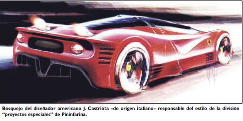 Pininfarina comenta acerca del perfil suave de los guardabarros, de la gran burbuja que constituye el habitáculo, las tomas de aire tipo Naca colocadas a los costados, bien modeladas.