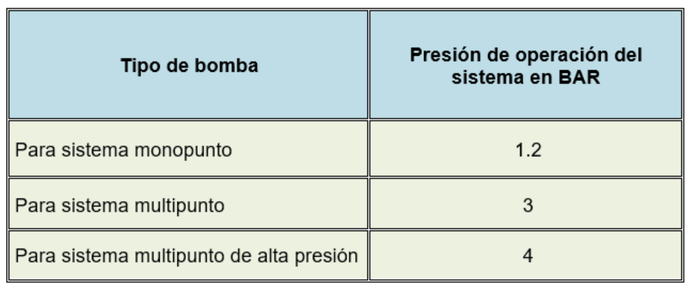 Tabla 1 - Presión de operación según sistema para las bombas de combustible eléctricas