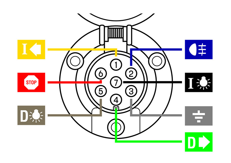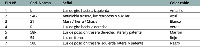 La distribución de pines en el enchufe es conforme a la norma ISO 1724, lo que garantiza la intercambiabilidad. Dicha norma establece la disposición de enchufes conectores de siete terminales tipo 12N en vehículos con 12V de tensión de alimentación nominal.