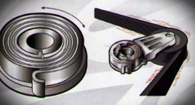 En el caso de los resortes planos, se trata de una lámina enrollada hasta obtener la precarga necesaria para dar la tensión a la correa. Esta característica hace que, entre cada vuelta del resorte, no haya demasiado espacio entre sí, lo que con el tiempo, lleva indefectiblemente a la producción de rozamiento y, consecuentemente, ruidos y atascamiento del mecanismo. Esto último compromete seriamente a la fuerza que ejerce sobre la correa.