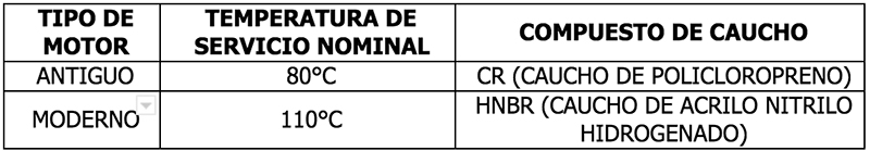 El empleo de una correa con material CR (temp. serv. 80°c) en lugar de una correa con material HNBR (temp. serv. 110°c) originara la degradación física de la misma, perdiendo las características elásticas y generando una falla prematura con la consiguiente rotura del motor.