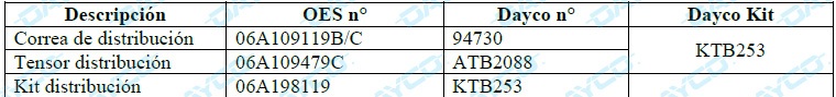 Información técnica Dayco. El Kit distribución KTB253 (OES 06A 198 119) Audi/Seat/Skoda/VW