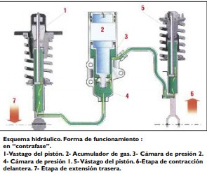 Introducción Se trata de un sistema de Control Dinámico de Recorrido, es decir del tramo que el vehículo recorre. El mismo con DRC en función del estado del camino, permite recorrerlo de forma estable y suave. Es un dispositivo que puede ser calibrado básicamente, para obtener un funcionamiento confortable mediante la combinación de la acción de resortes y amortiguadores. Trabaja con el uso activo del volumen de aceite que desplaza el vástago del pistón del amortiguador. Se desarrolla entonces un accionamiento en coincidencias de fases o en contrafases hidráulicas que tiene como resultado una "inmersión amortiguada" (esquema hidráulico controlado por la válvula central). Funcionamiento Los sistemas convencionales de suspensiones y amortiguación representan siempre una solución intermedia entre el confort de conducción máximo posible y un comportamiento deportivo.