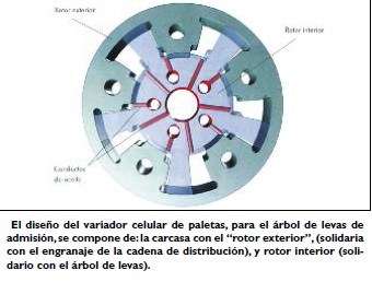 El máximo reglaje equivale a 52 grados del cigüeñal. El mismo se realiza en función del grupo de características, que lleva incorporada como programación la unidad de control electrónico del motor. En cuanto al diseño del variador cellular de paletas, para el árbol de levas de admisión, el mismo está compuesto por lo siguiente:
