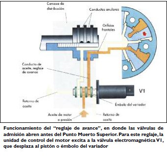 Antes de analizar, las señales que vienen del transmisor hall, la unidad de control del motor detecta la posición momentánea del árbol de levas de admisión. De acuerdo al grupo de características programadas en la unidad de control del motor se procede entonces a desfasar, la posición de los árboles de levas. Después de ser excitada por la unidad de control del motor, la válvula 1 para el reglaje de la distribución variable, desplaza al pistón del variador por ejemplo en dirección de "avance". El aceite a presión pasa a través de la carcasa o cárter de distribución hacia el variador del árbol de levas y desfasa o desplaza al árbol, en dirección de "avance".