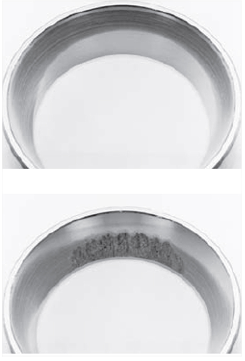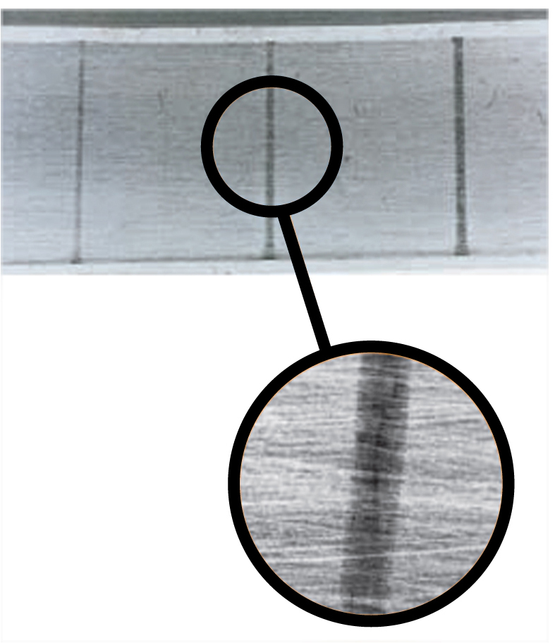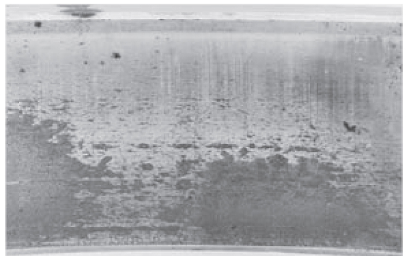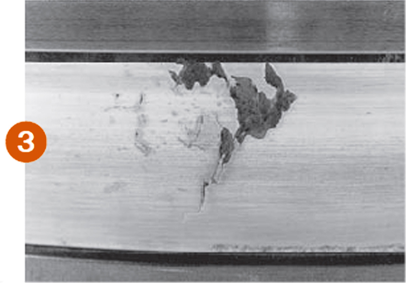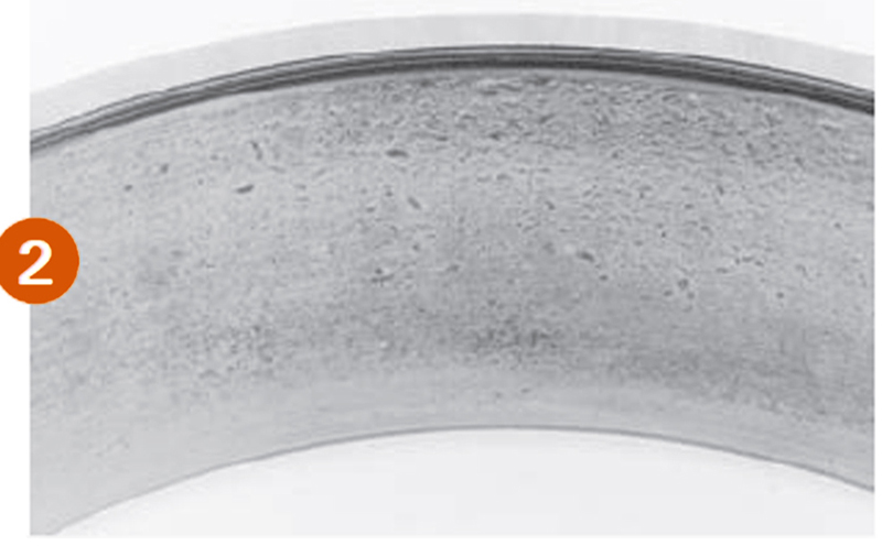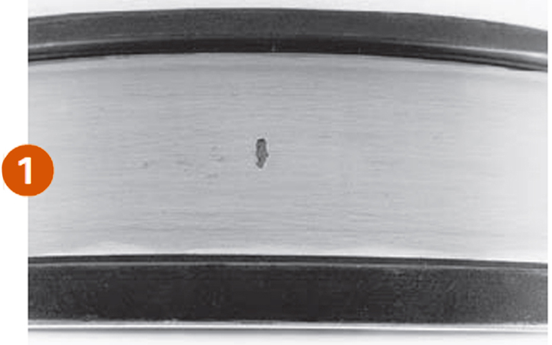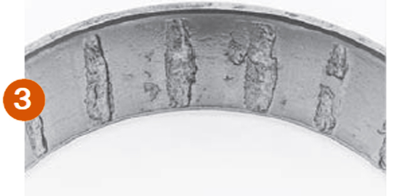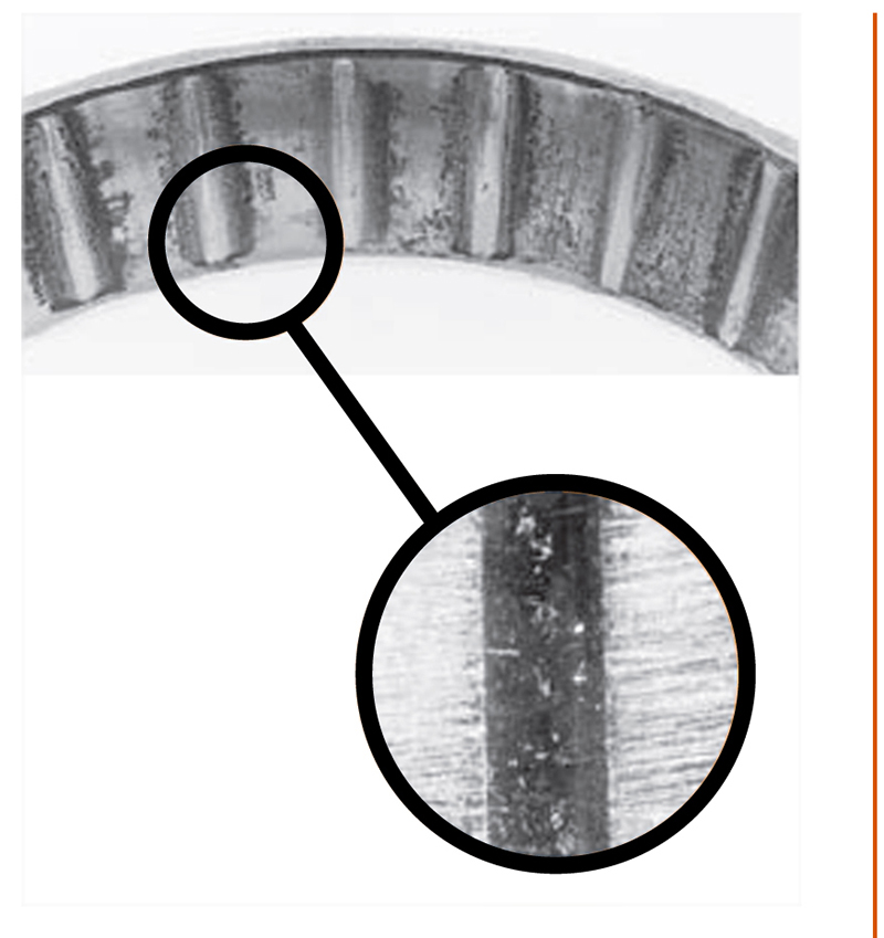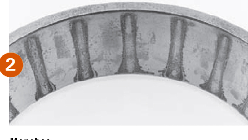 Líneas de descamación espaciadas por los rodillos, en cojinetes mantenidos en servicio después de un fallo de corrosión.